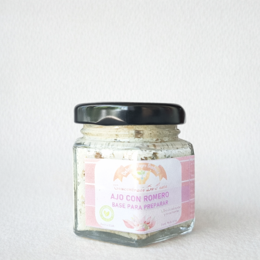 Pasta de ajo con romero concentrada y elaborada de manera artesanal, cuidando la originalidad y calidad de cada ingrediente. Se prepara con ajo fresco y romero natural, combinados con aceite y sal, sin aditivos ni conservantes. Su elaboración en pequeñas partidas permite mantener intactos su aroma, sabor y textura. Una vez lista, la pasta se envasa en frascos para una adecuada conservación y presentación práctica. Es un producto versátil que se utiliza como base para preparar diversas recetas, condimentar carnes, verduras y salteados, o para dar un toque casero y natural a las comidas. Contenido 60gr y elaborado por Agro Dadinco.