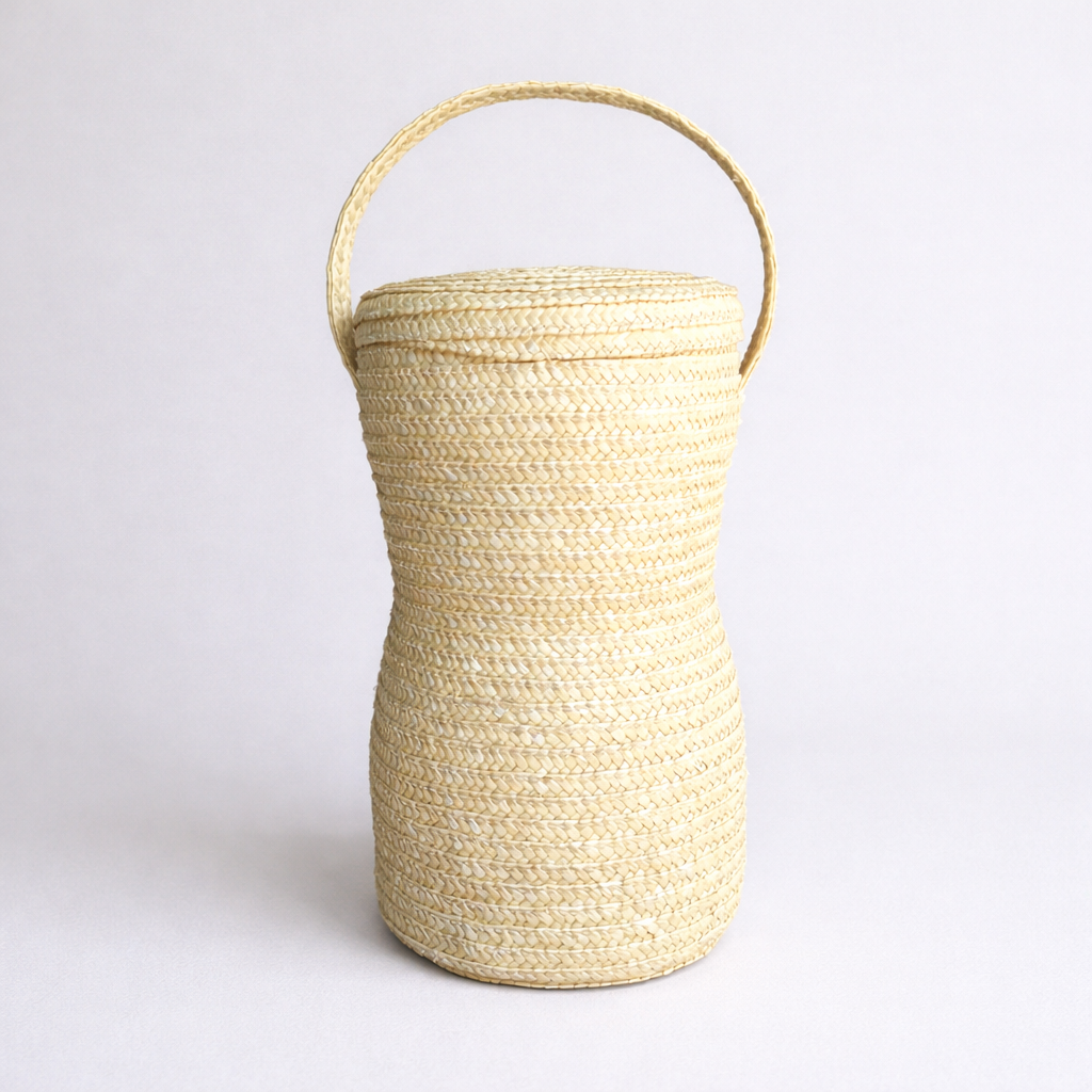 Este porta termo redondo está hecho con paja de trigo. Es una pieza útil y a la vez especial, creada con paciencia y dedicación, que refleja el trabajo y la tradición del campo. La técnica de la cuelcha consiste en trenzar espigas secas de trigo y coserlas para formar objetos firmes y duraderos. Es un oficio antiguo que se aprende con el tiempo y el cuidado por los materiales. Fabricado por las Colchanderas de Quirihue, mujeres que mantienen viva esta tradición del secano costero de Ñuble.